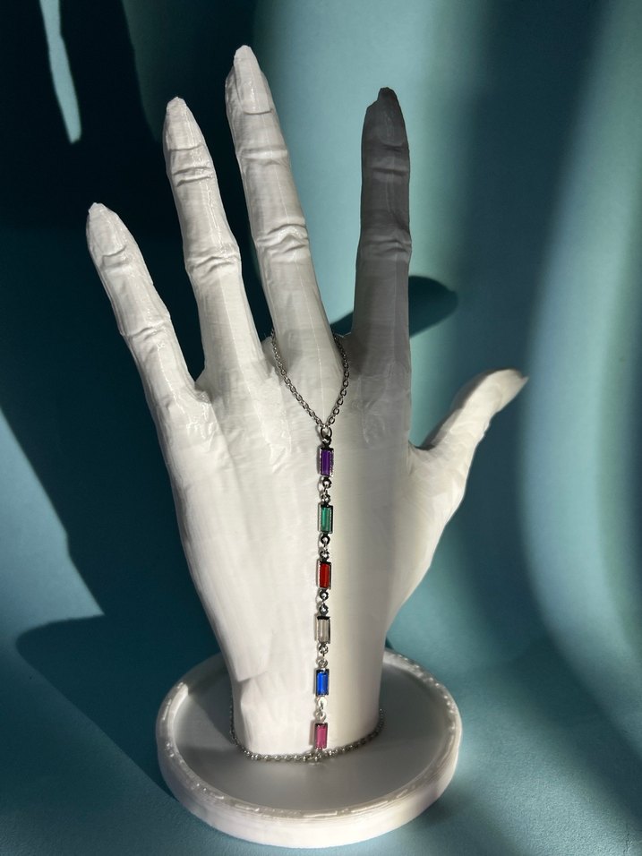 Kadın el zinciri, renkli boncuklar ve gümüş zincirle bohem ve retro tarz sunar, hafif batik desenlidir.