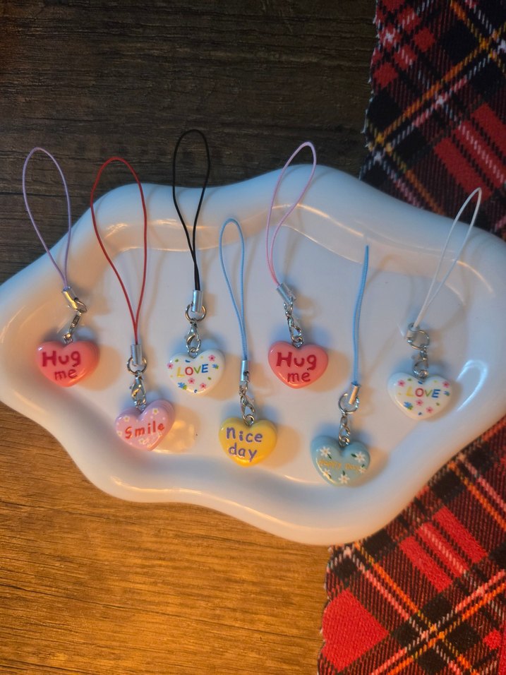 Renkli boncuklu kalp şeklinde charmlar, üzerinde 'Hug me', 'Smile' ve 'Love' gibi pozitif kelimeler bulunur. Günlük kullanıma ve bohem tarzına uygundur. Telefon charmıdır.Tekli fiyattır.