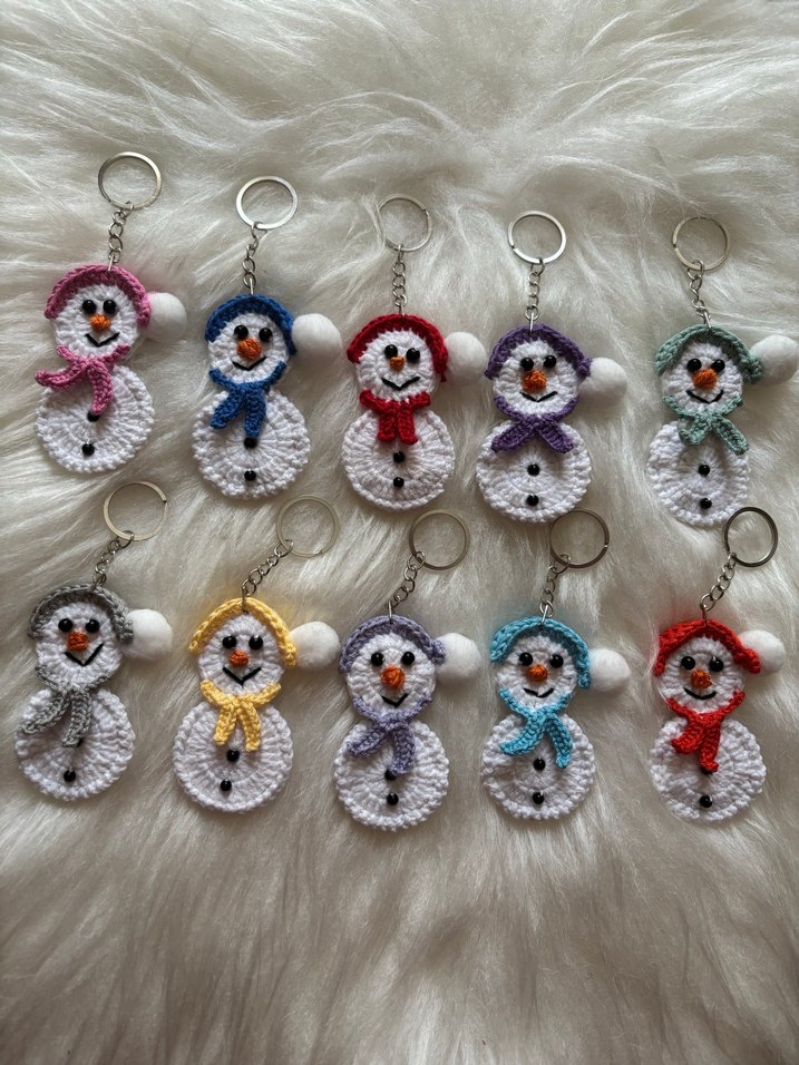 Renkli boncuklu, örgü kardan adam figürlü anahtarlıklar. Farklı renklerde atkı ve şapkalı, bohem tarzda rahat tasarım. ❄️adet 32 tl