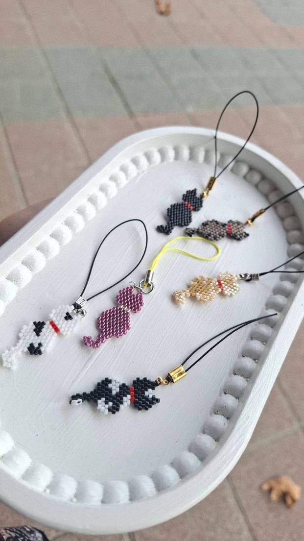 Çeşitli tasarımlarda, renkli boncuklardan yapılmış kedi figürlü telefon askıları.