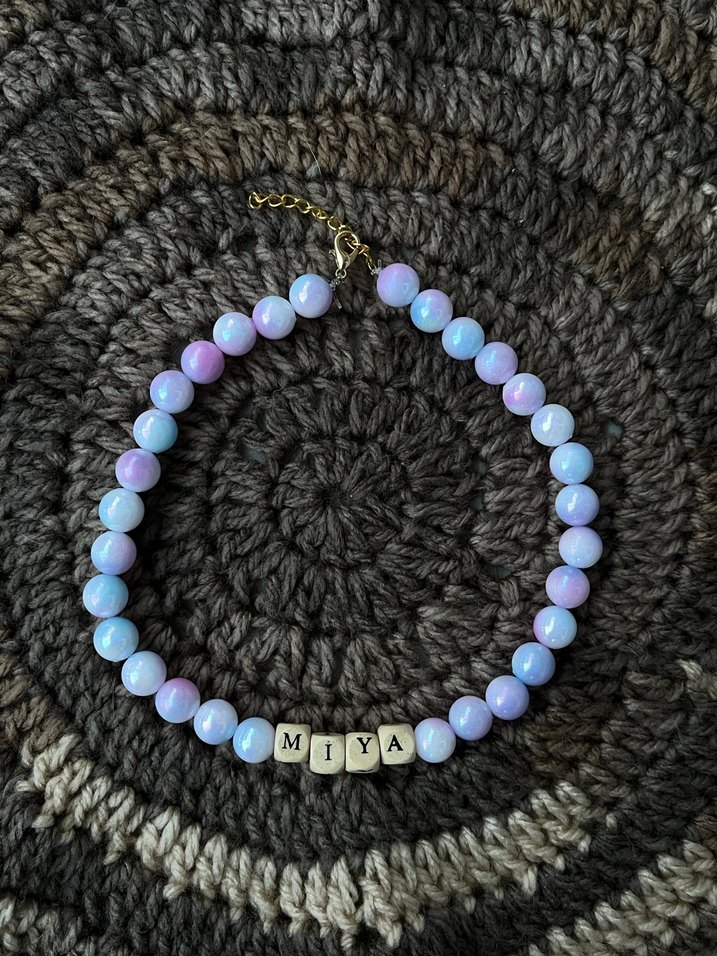 Pastel tonlarda, çok renkli boncuklardan oluşan ve 'MIYA' harfli boncuklar içeren, rahat ve bohem tarzlara uygun midi uzunlukta tasma