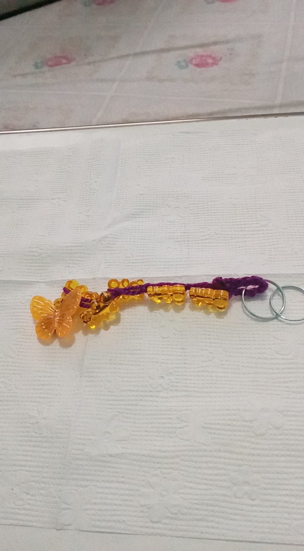 Renkli boncuklar ve kelebek figürlü, bohem ve minimalist tarzda kadın anahtarlık. İki metal halka ile anahtarlarınızı tutar.