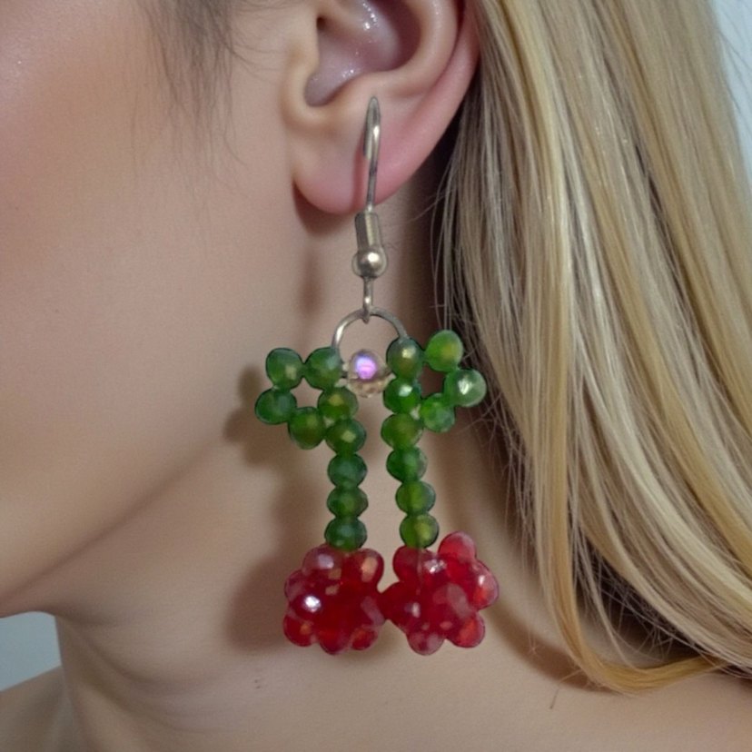 Boncuklu detaylı, kiraz şeklinde renkli küpeler. Bohem ve avangart tarzlara uygundur.
