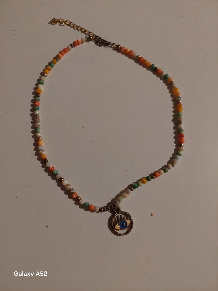 Kısa uzunlukta, çok renkli boncuklardan oluşan bohem tarzda kolye. Ortasında göz figürlü yuvarlak bir kolye ucu bulunur.