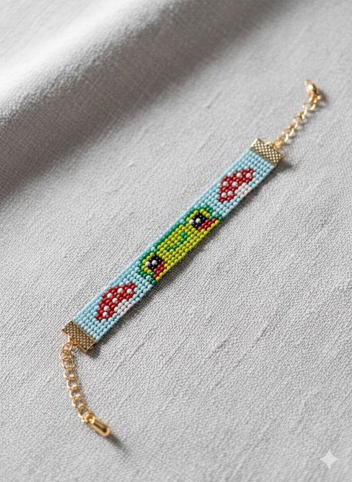 Renkli boncuklardan oluşan, kurbağa desenli bohem tarzda bileklik. Canlı renkleri ve zarif zinciriyle dış mekan kullanımı için uygundur.