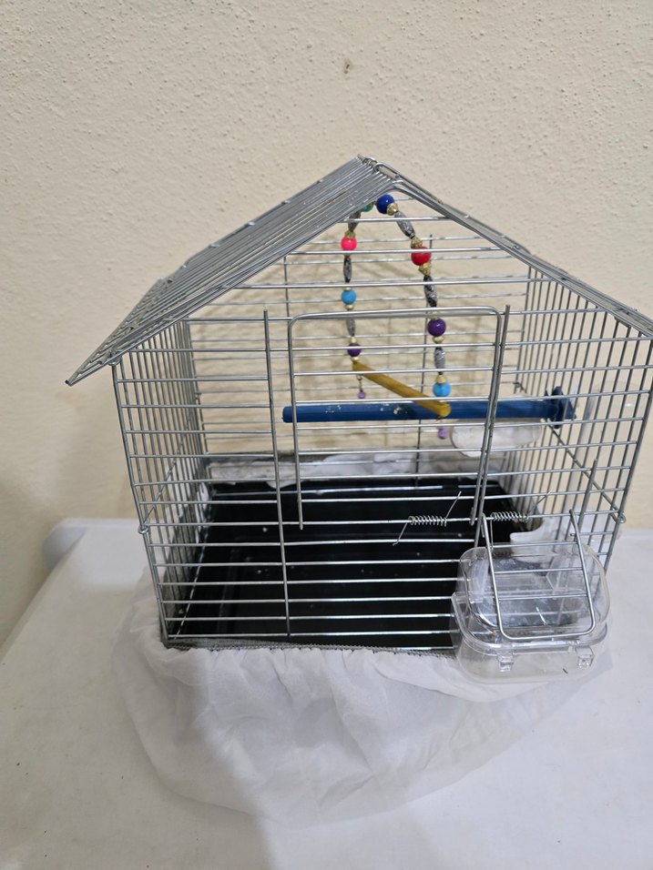 Renkli boncuklu halka, tünek ve yemlik içeren gri kuş kafesi. Alt kısmında döküntüleri tutan file bulunmaktadır.