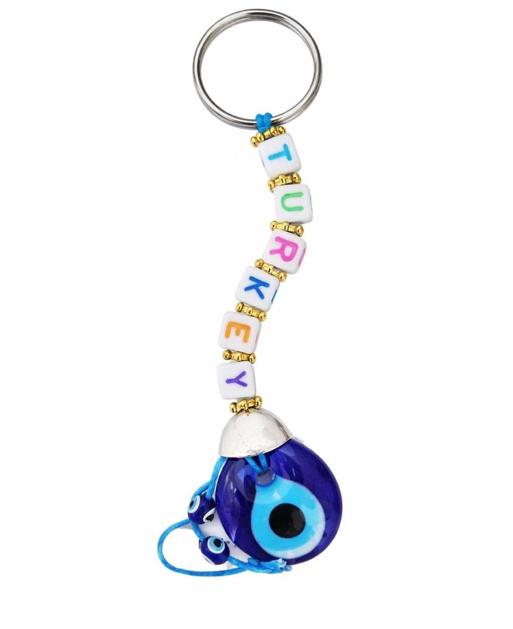 Renkli boncuklar ve 'TURKEY' harfleriyle süslenmiş, mavi nazar boncuğu detaylı bohem ve minimalist tarzda anahtarlık.