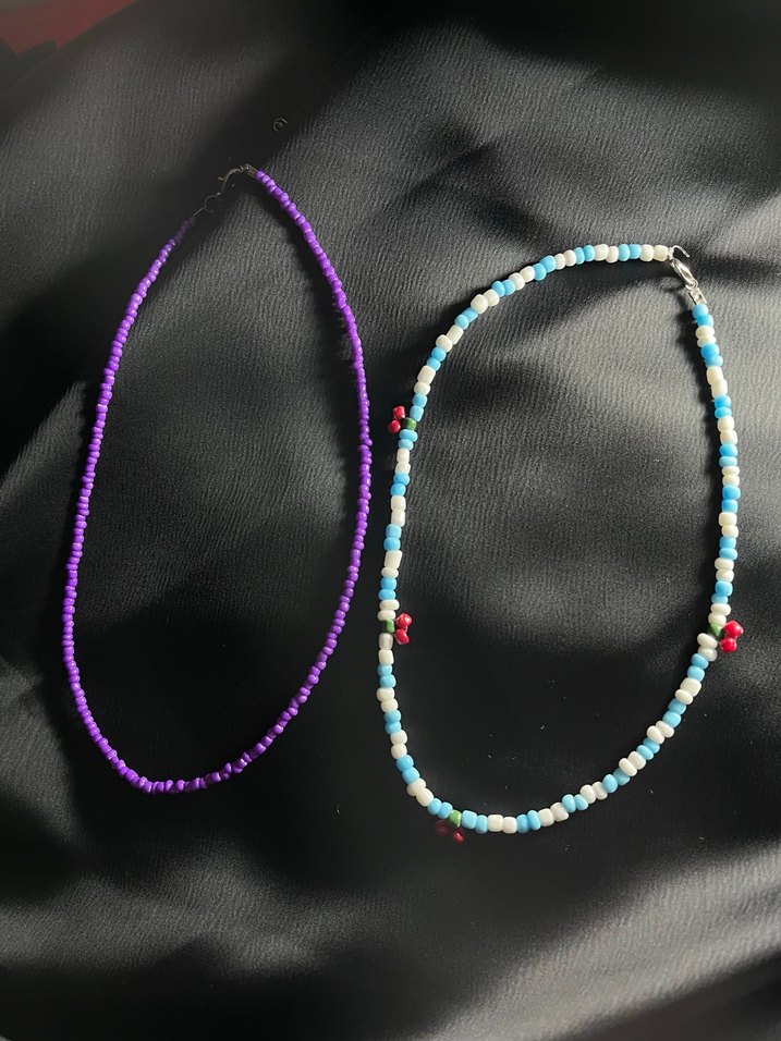 2 ‘li renkli boncuklardan oluşan, bağlama desenli iki adet midi uzunlukta kolye seti. Bohem ve minimal tarzlar için uygundur.