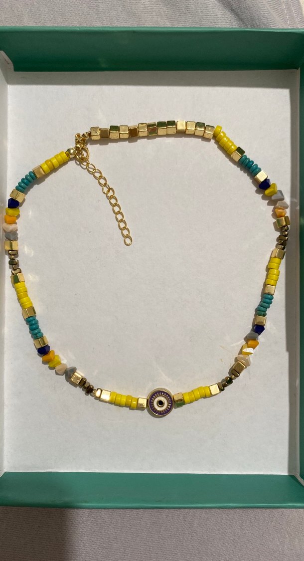 Renkli boncuklardan oluşan kısa uzunlukta bohem tarzda mini kolye, günlük kullanıma uygun. Altın renkli toka ve bağlama zinciri bulunur.