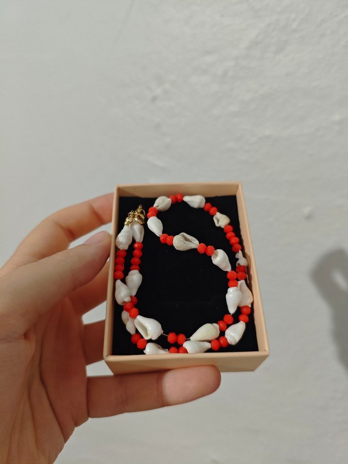 Kısa uzunlukta, kırmızı ve beyaz renkli boncuklarla bezenmiş, günlük kullanıma uygun bohem tarzda kolye. #turuncu #boncuk #deniz #kabuğu #kolye