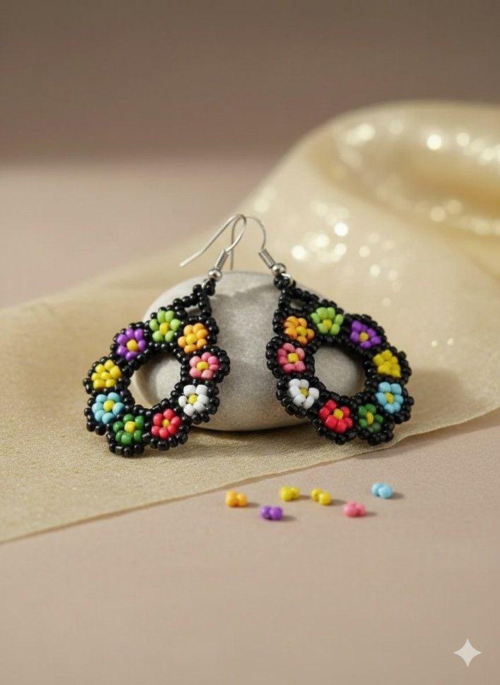 Renkli boncuklarla süslenmiş, kısa uzunlukta mini çiçek desenli, bohem tarzda küpelerdir.
