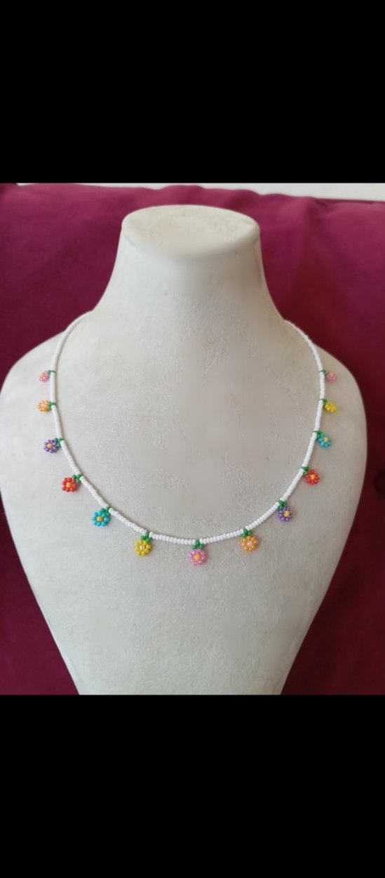 Renkli kum boncuklardan yapılmış çiçek desenli kadın kolyesi. Bohem ve retro tarzıyla günlük kullanıma uygundur. ( istenilen uzunlukta yapılır )