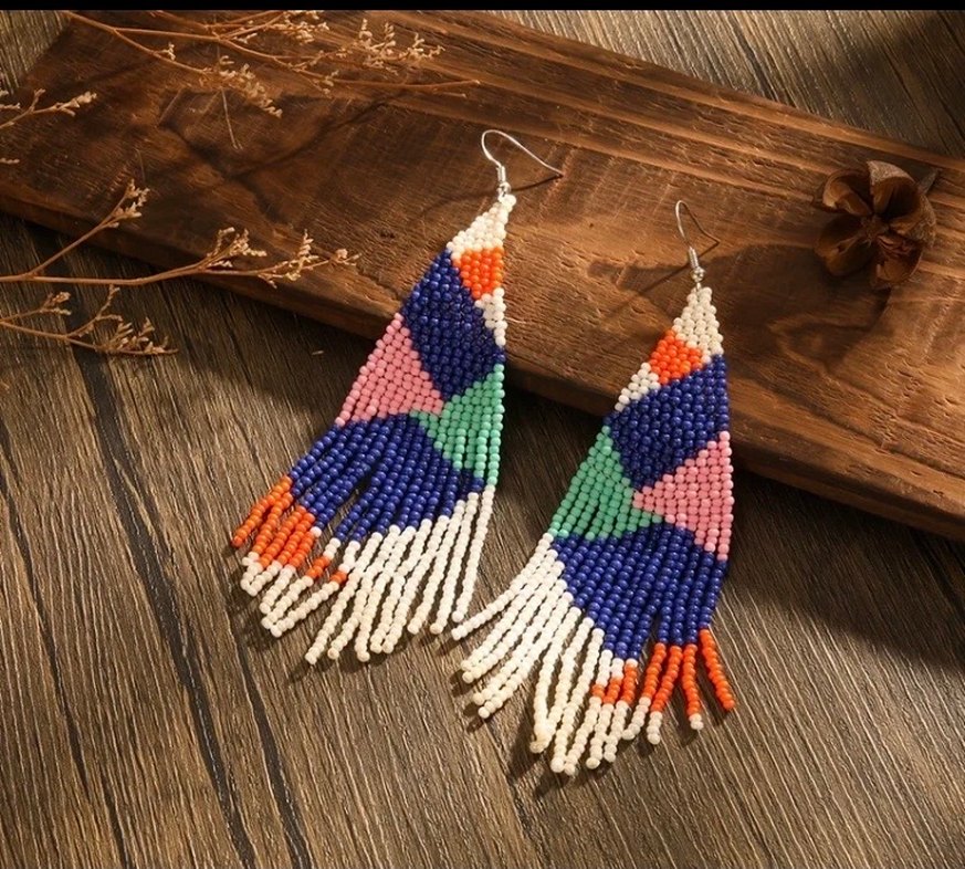 Uzun, renkli boncuklardan oluşan, desenli bohem tarzda küpeler. Dış mekan etkinlikleri için canlı bir görünüm sunar.