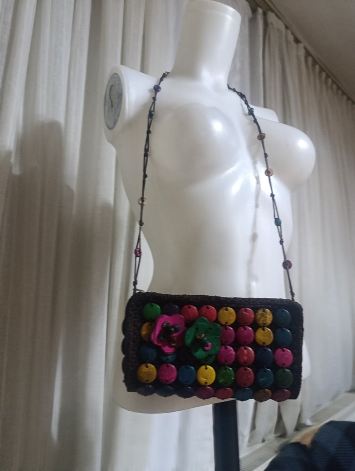 Boncuk detaylı renkli örgü çanta, batik desenli, bohem tarz partiler için uygun.