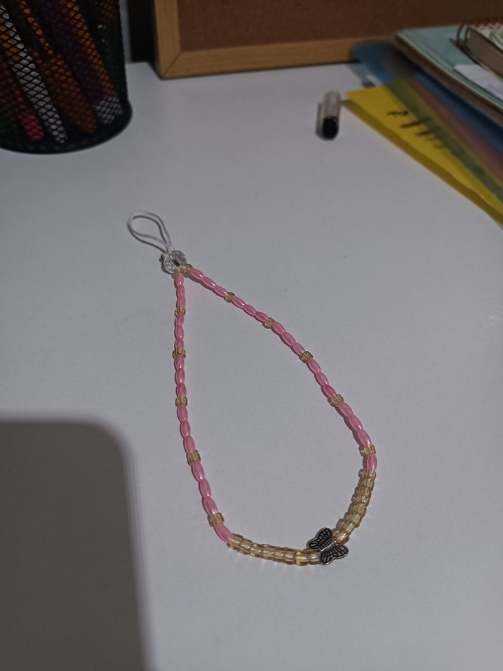 Pembe ve bej boncuklardan oluşan, küçük metal kelebek detaylı, renkli ve bohem tarzda kadın charm, hafif yılan deseniyle tamamlanmıştır.