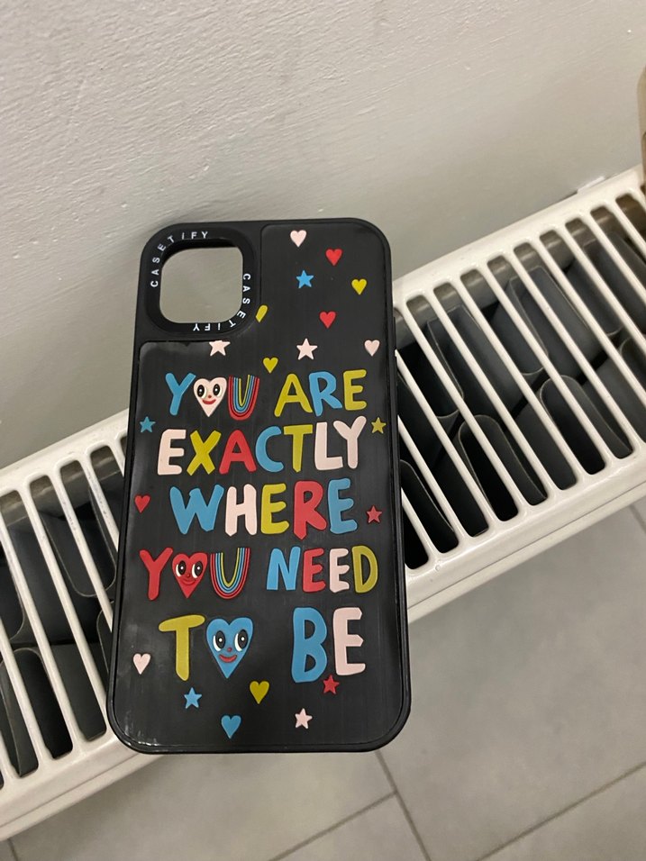 Koyu renkli, çok renkli pop kültür tasarımlı telefon kılıfı. Renkli harfler ve küçük kalplerle süslenmiş, boncuk detayları içerir.