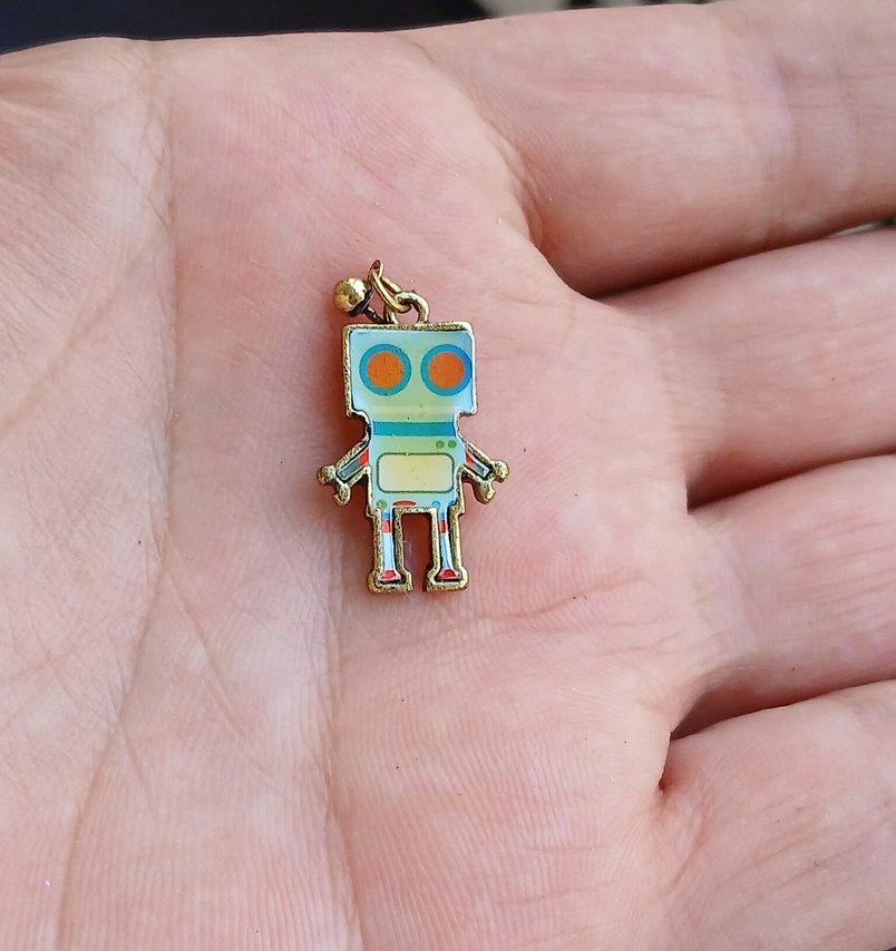 Altın renkli, boncuk detaylı ve baskılı robot figürlü renkli kadın charm. Bohem ve retro tarzlara uygun, günlük kullanım için ideal.