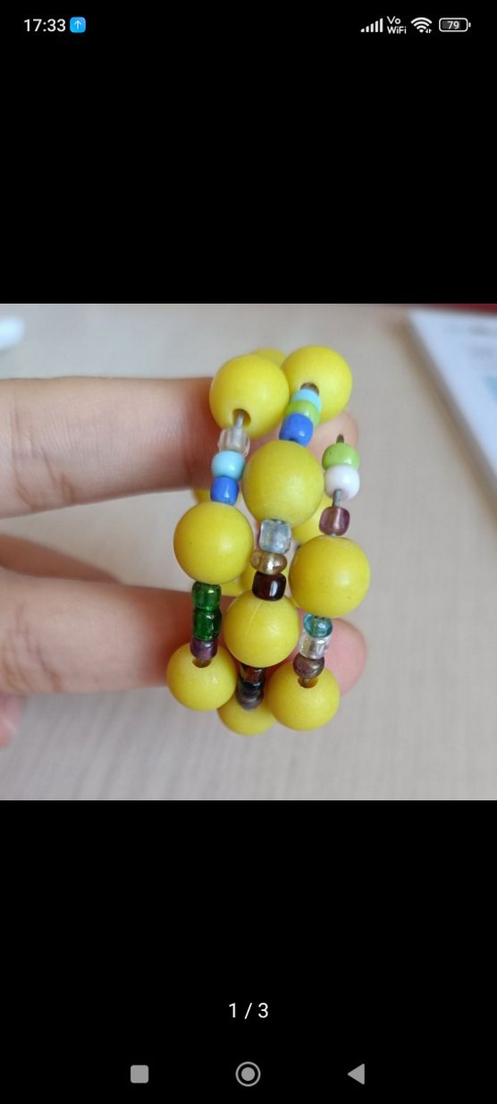 Büyük sarı boncuklar ve küçük renkli boncukların bir araya geldiği renkli bohem tarzda bileklik. Tie-dye desenli, retro ve hippie havası verir.