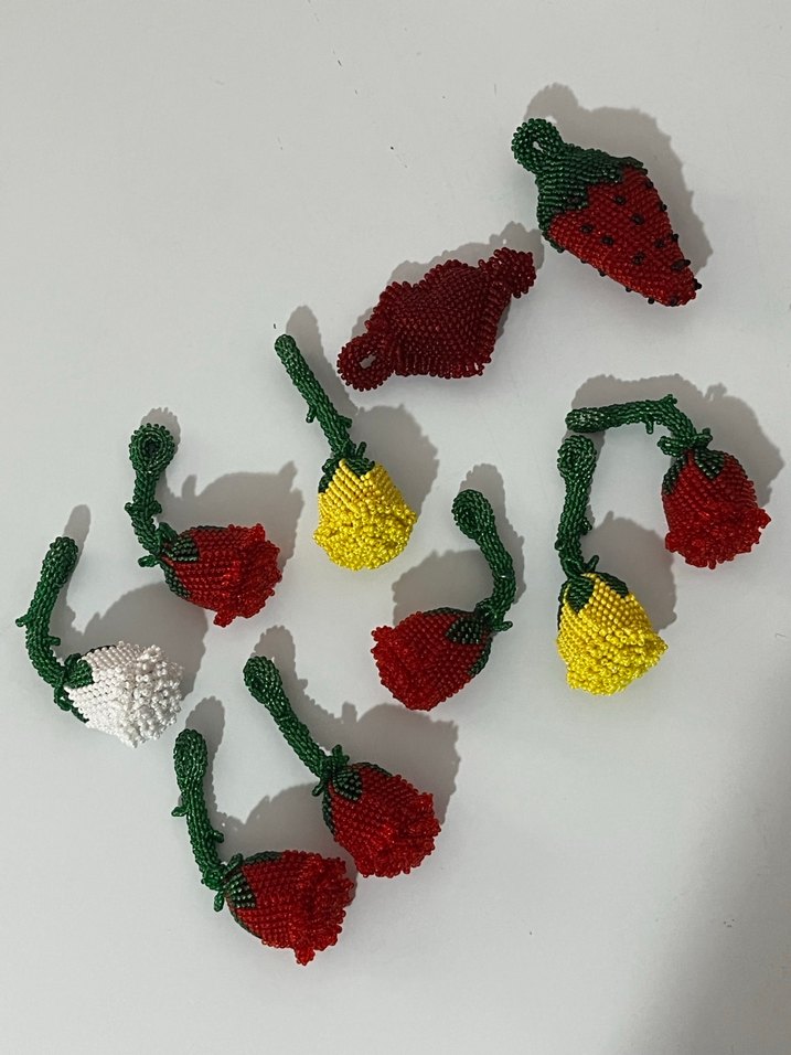 Meyve ve çiçek şeklinde renkli boncuklu tırnak süslemeleri, tırnaklara canlı detay katar.