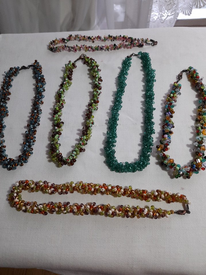 Uzun ve renkli boncuklardan oluşan, desenli bohem tarzda kadın kolyeleri. Parti için uygun, canlı renklerle dikkat çeker.