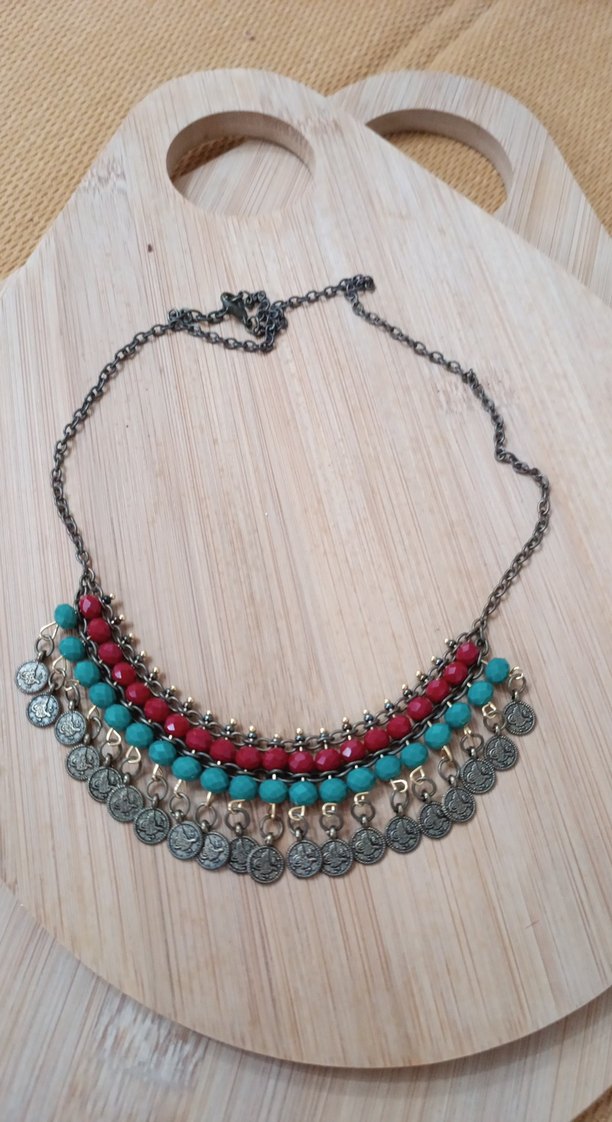 Uzun uzunlukta, renkli boncuklar ve nakış desenleri ile süslenmiş, küçük para figürlü bohem tarzda kadın kolyesi.
