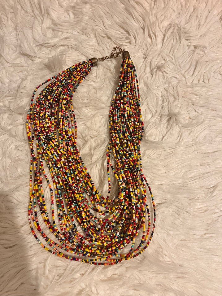 Renkli boncuklardan oluşan uzun bohem tarzda, bağlama desenli kadın kolye. Günlük kullanıma uygundur.