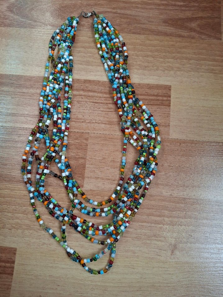 Renkli boncuklardan oluşan çoklu iplikli uzun kolye, bohem tarzını yansıtır. Günlük kullanıma uygun, canlı ve retro bir görünüm sunar.