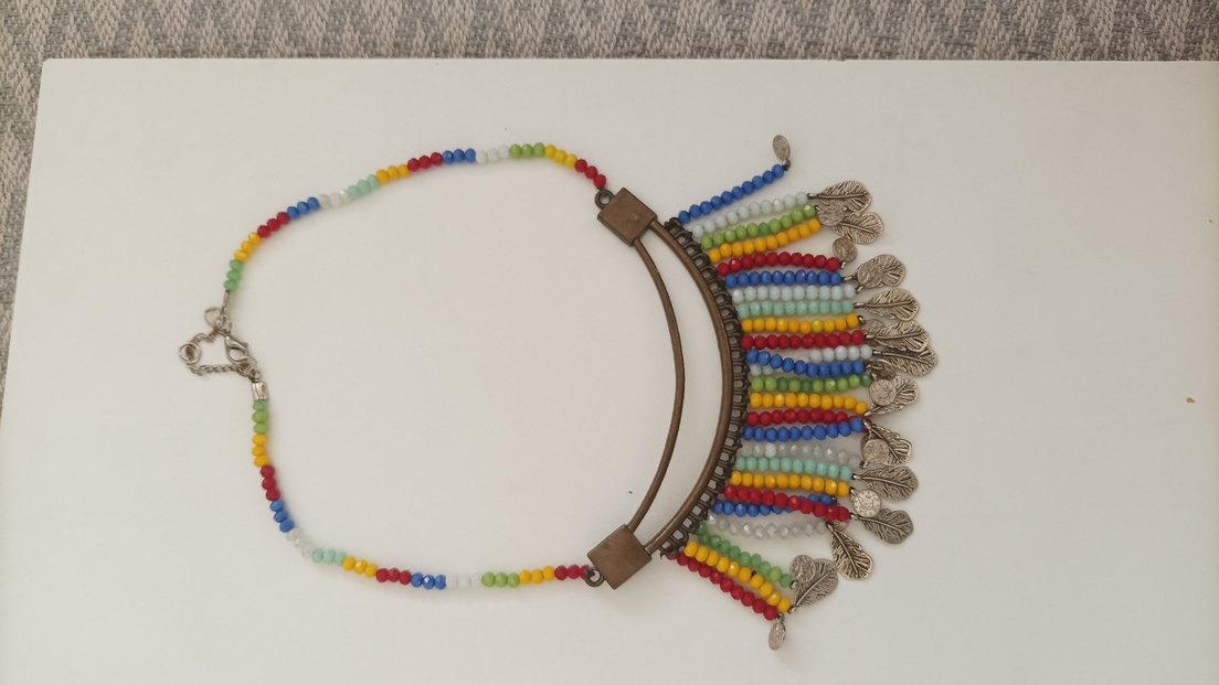 Renkli boncuklar ve etnik desenler içeren uzun bohem tarzı kolye, günlük kullanım için uygundur.
