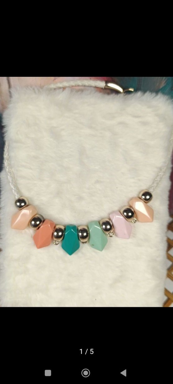 Pastel renklerde boncuklu taşlar ve metalik yuvarlak boncuklar içeren uzun bohem tarzda günlük kullanıma uygun kolye.