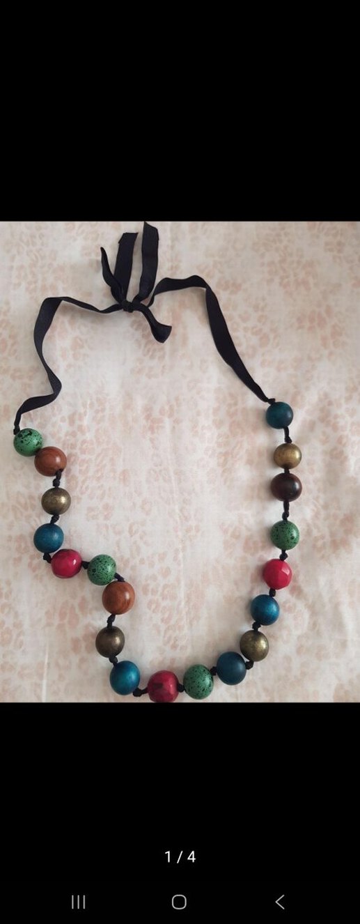 Uzun boyda, siyah bağlamalı, çok renkli büyük boncuklardan oluşan bohem tarzda kolye.