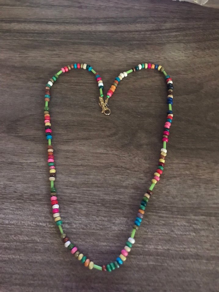 Renkli boncuklardan oluşan uzun, bağlama desenli bohem tarzda günlük kullanım için uygundur.