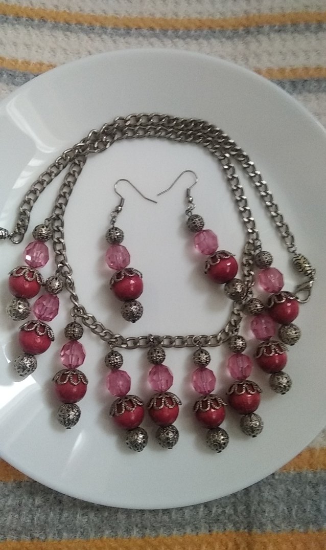 Renkli pembe boncuklar ve metal detaylarla süslenmiş uzun bohem kolye ve küpe seti, günlük kullanıma uygun retro tarzda.