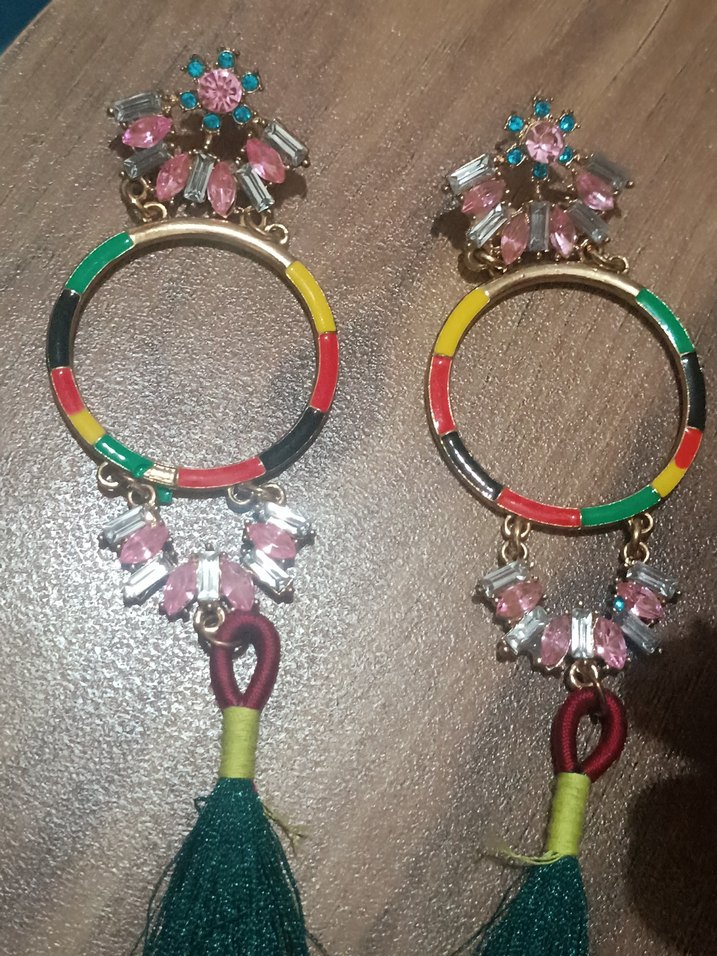 Renkli boncuklu desenlere ve püskül detaylara sahip uzun bohem küpeler, parti için uygun.
