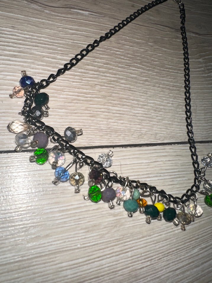 Uzun uzun zincir üzerinde çok renkli boncuklar bulunan, bohem ve retro tarzda gündelik kullanıma uygun bir kolye.