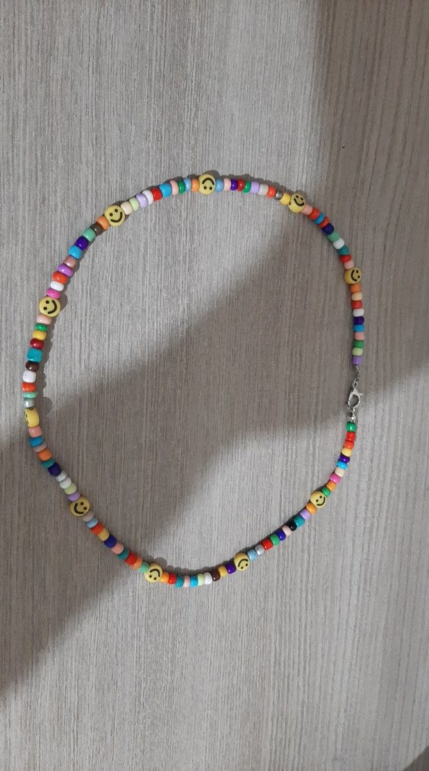 Renkli boncuklar ve gülen yüz detaylarıyla uzun kadın kolyesi, bohem ve retro tarzı yansıtıyor. Günlük kullanıma uygun.