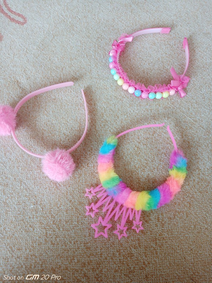 Renkli pembe çocuk taçları boncuk ve ponpon detaylarıyla bohem tie-dye tarzında. Çocuk saçlarına neşeli bir dokunuş katmak için uygundur. birkaç kez takıldı hiç bir sorunu yoktur