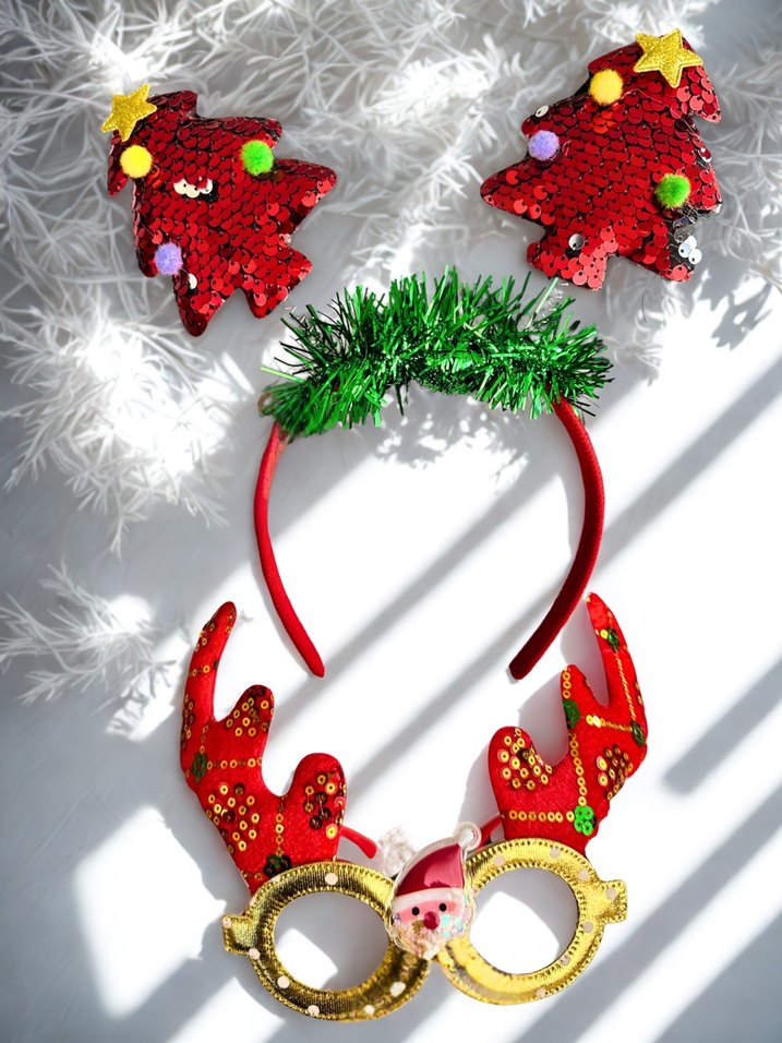 Renkli, boncuk işlemeli kırmızı yılbaşı temalı çocuk saç bantları ve tokaları. Eğlenceli ve şık tasarımlarla tatil havası yaratır.