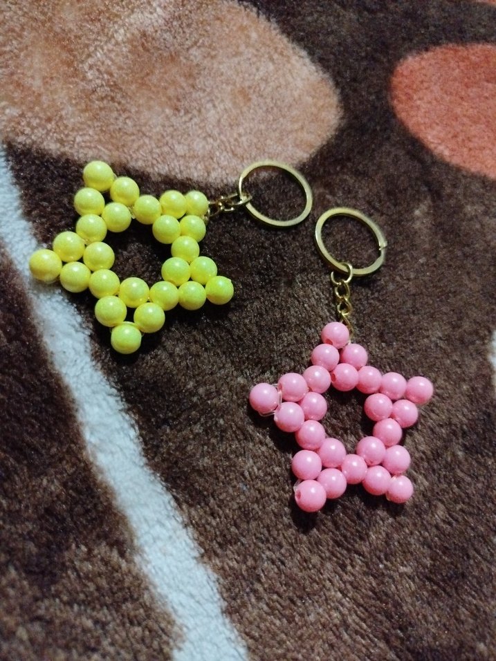 Sarı ve pembe renklerde boncuklarla yapılmış yıldız şeklinde anahtarlıklar. Bohem tarzda, rahat ve retro görünüm sunar.