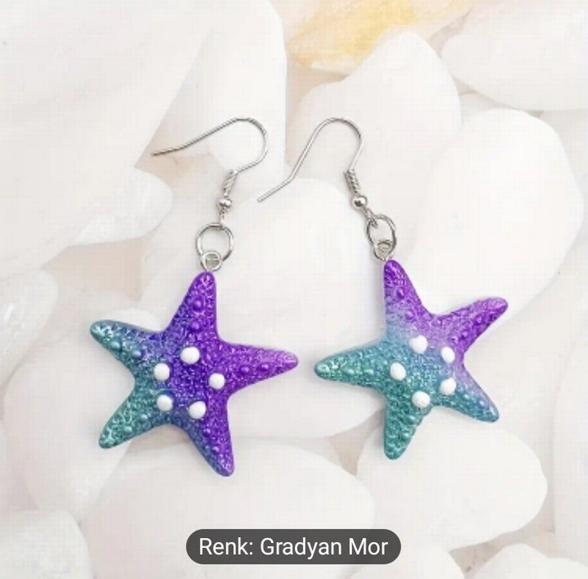 Renkli boncuklu, mor ve yeşil tonlarında gradyan desenli yıldız şeklinde midi uzunlukta küpeler. Bohem tarz ve plaj kullanımı için uygundur.