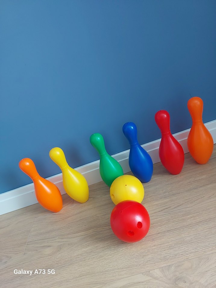 Çok renkli bowling oyuncak seti, birden fazla pimi ve topu ile eğlenceli oyunlar için uygundur.
