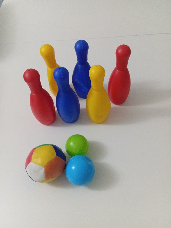 Renkli bowling topları ve farklı renklerde üç top içeren oyuncak seti.