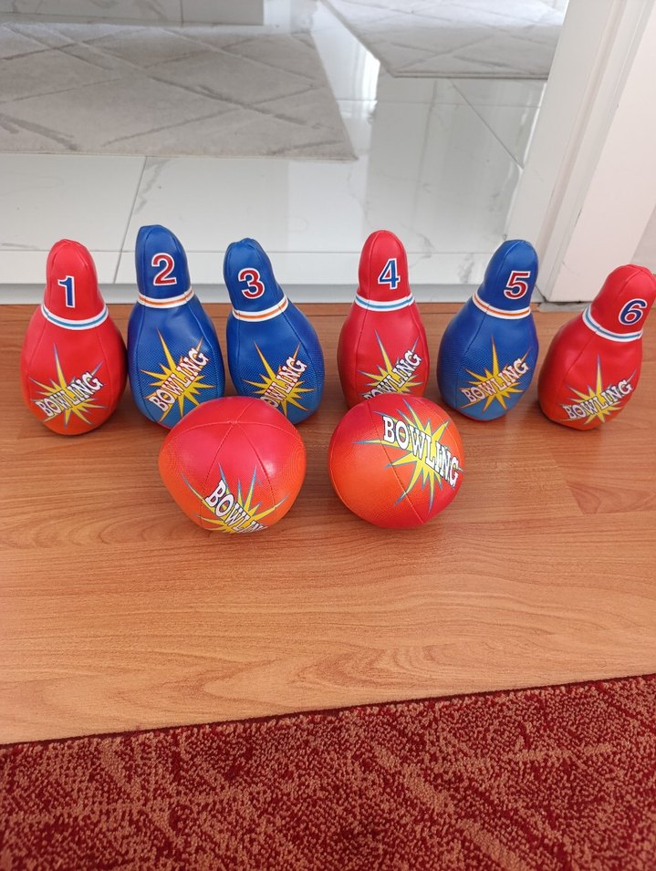 Numaralı renkli pinler ve iki kırmızı top içeren renkli içi elyaflı yumuşak bowling oyuncak seti.