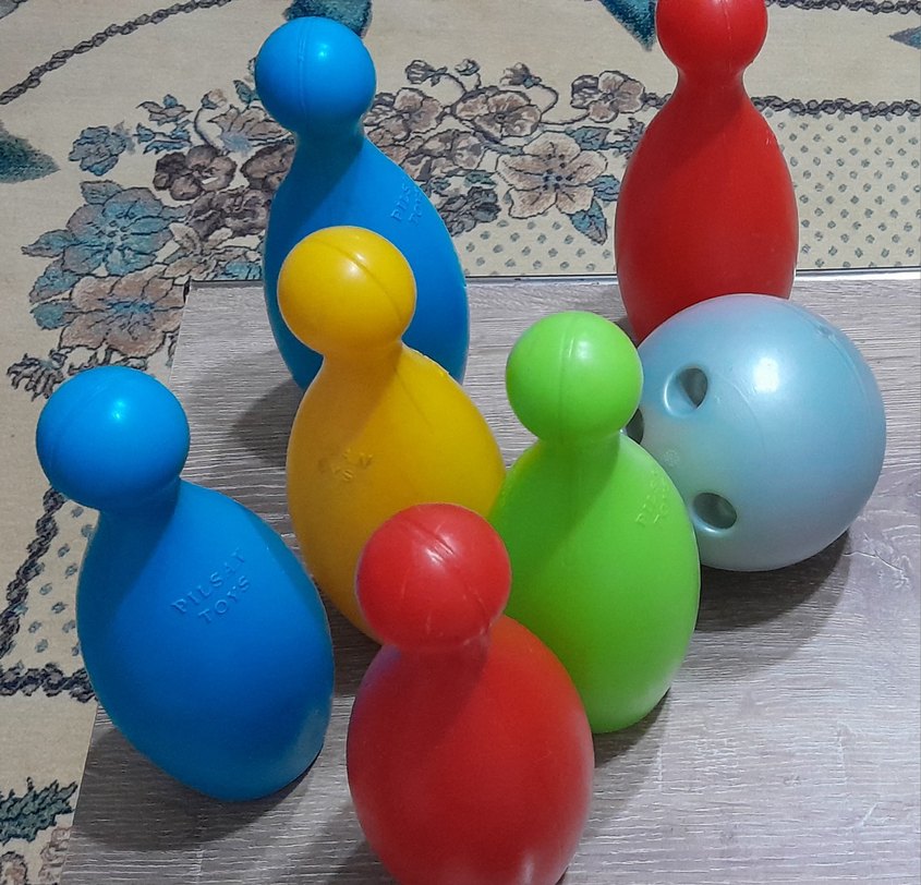 Pürüzsüz plastikten yapılmış, eğlenceli iç mekan oyunları için renkli bowling topları ve pinler.