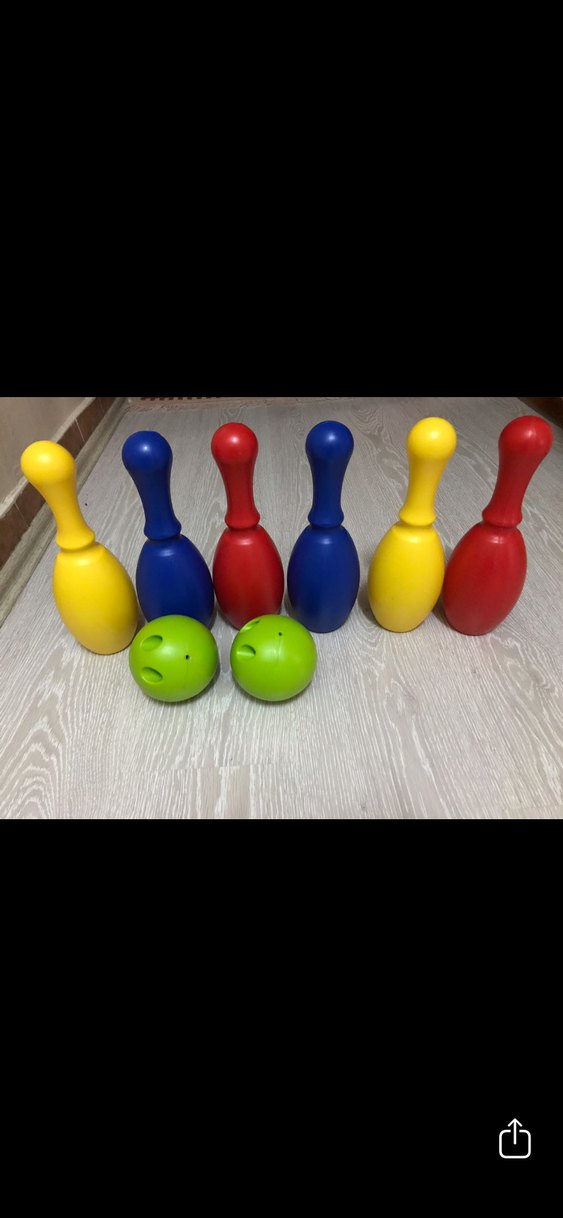 Büyük boy Sarı, mavi ve kırmızı renklerde altı topaç ve iki yeşil top içeren renkli bowling seti.