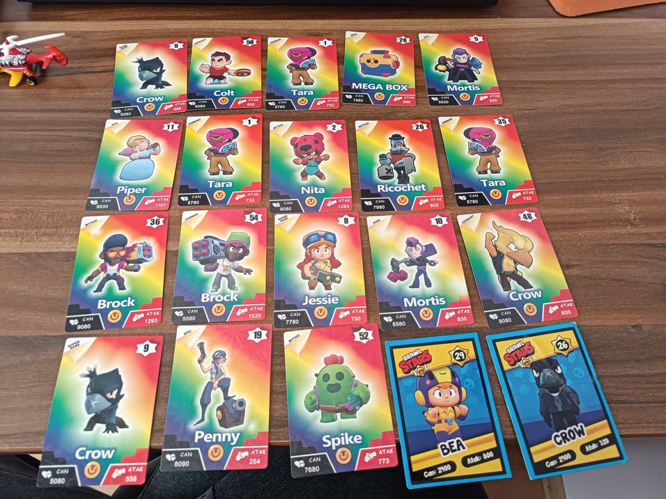 Renkli Brawl Stars Kart Oyunu Seti 17 kart içerir ekran hologramlidir. ışıkta parlar. Çeşitli kahraman ve istatistiklere sahip renkli Brawl Stars karakter kartları. Mega Box ve Spike, Bea gibi özel kartlar içerir.