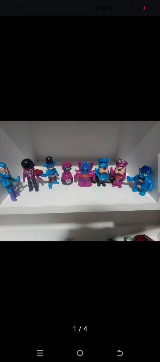 Çeşitli kostüm ve aksesuarlara sahip, ağırlıklı olarak mavi tonlarında renkli aksiyon figürleri seti. Koleksiyoncular için uygun. 8 adet