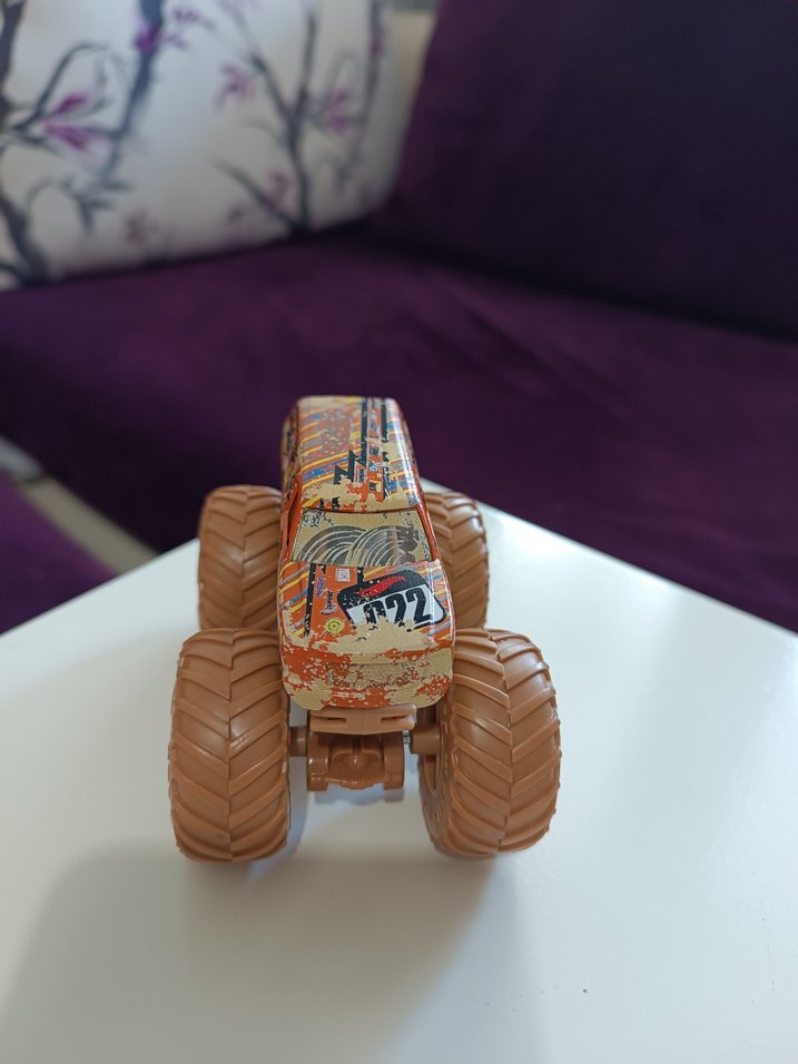 Büyük kahverengi tekerleklere ve detaylı desenlere sahip renkli bir oyuncak araba. Oynama ve sergileme için uygundur.