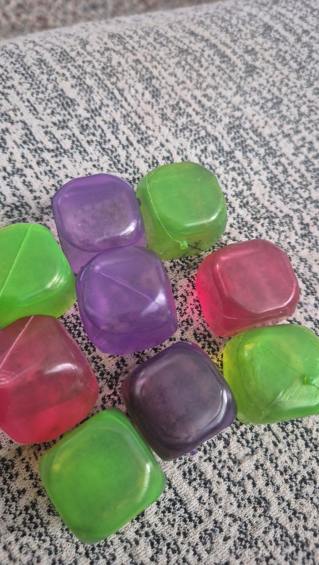 Yeşil, mor ve kırmızı renklerde, şeffaf görünümlü küçük buz kalıpları,meşrubat bardaklarınıza hava katsın✨️