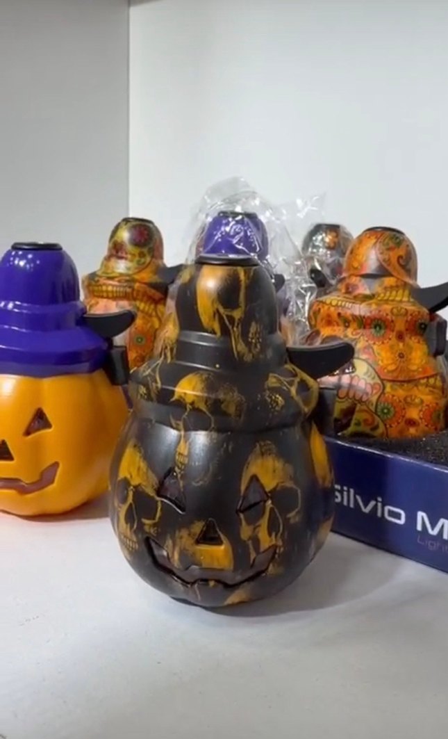 Çeşitli tasarımlı ve şapkalı renkli Cadılar Bayramı kabak figürlü çakmak, eğlenceli ve şenlikli görünüme sahip. Üzerinde 'silvioM' işareti bulunur. Diğer çeşitler için kaydırarak bakabilirsiniz Sıfır üründür Mağaza "Sevim Sultan Takı"