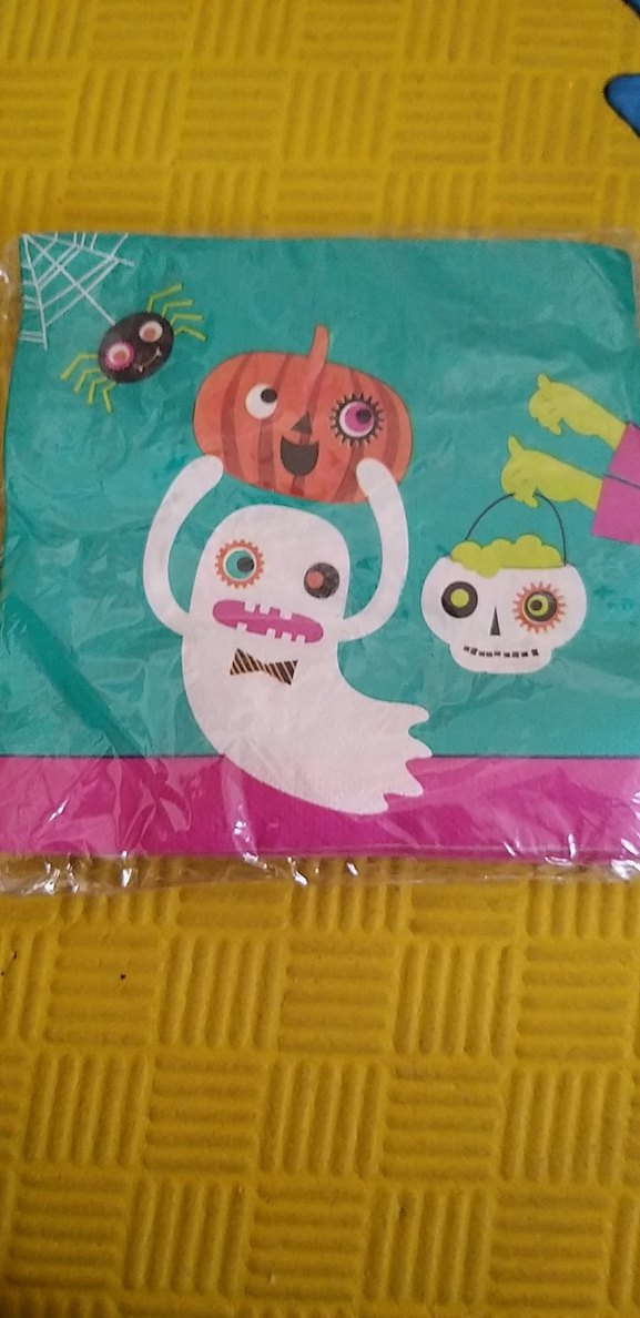 Renkli Cadılar Bayramı temalı parti peçeteleri, oyuncu bir hayalet, balkabağı ve kafatası figürleriyle süslenmiştir. ️